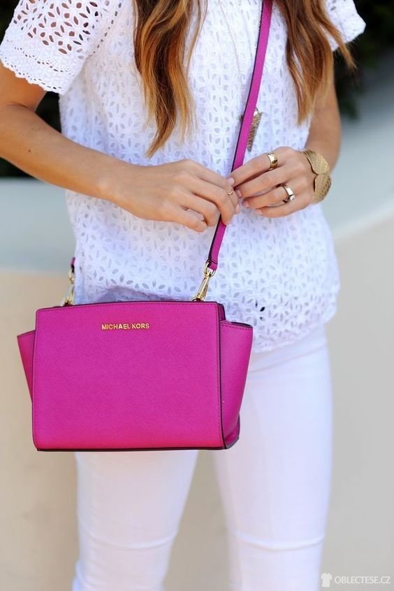 Nebo oblečte klasický černý blejzr, bílý top a džíny a k tomu si oblečte fuchsiovou kabelku. Běžný neformální look tato kabelka povznese o několik levelů výše.